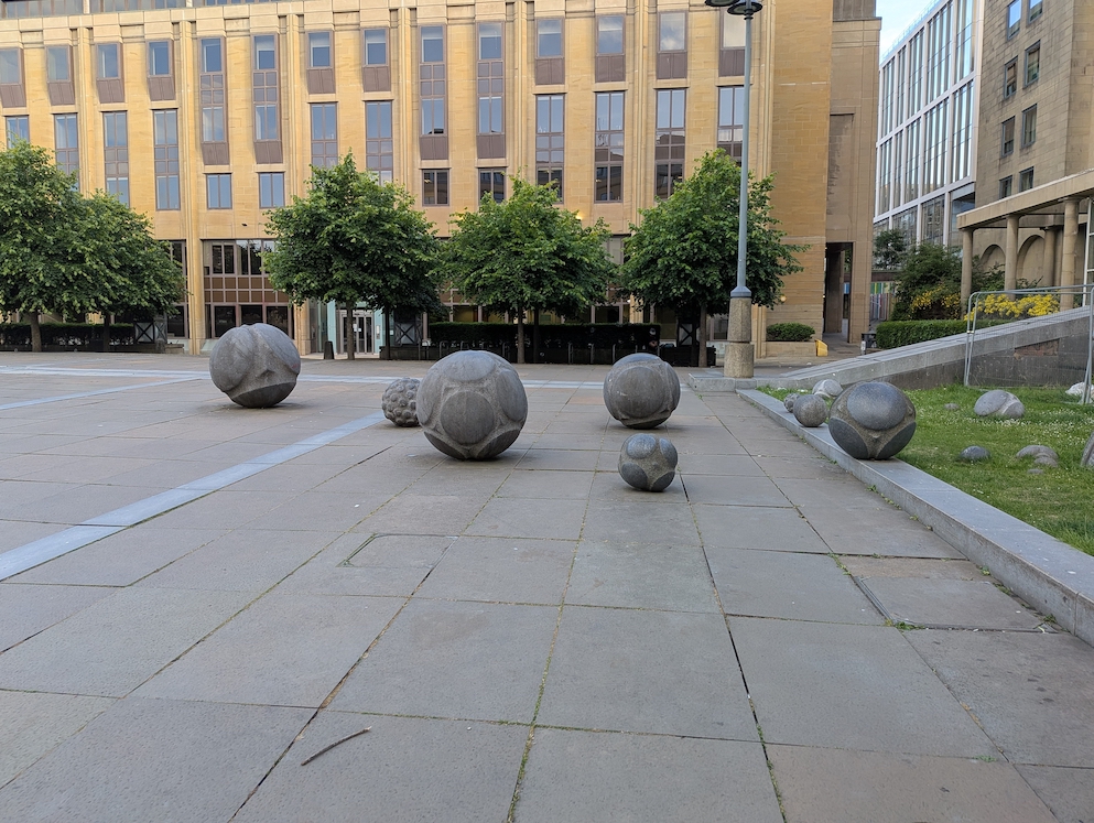 I was working at a veterinary congress in Edinburgh this weekend, and on Saturday evening my colleagues and I were walking through the centre to find somewhere to eat when I spotted these sculptures! I dragged them over to tell them what they were, and excitedly showed them photos of the actual neolithic balls and explained your theory (and recommended The Memory Code of course). Some of the sculptures were football sized and others up to my waist. It made my day to see them!